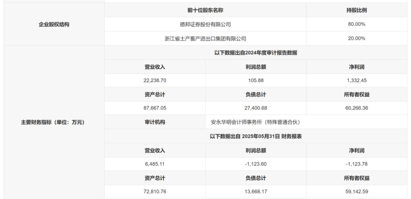 挂牌公告同时透露了德邦基金的近期财务数据:2024年全年,公司实现营业收入2.22亿元,净利润1332.45万元;2025年前五个月,营业收入为6485.11万元,净利润出现1123.78万元的亏损。