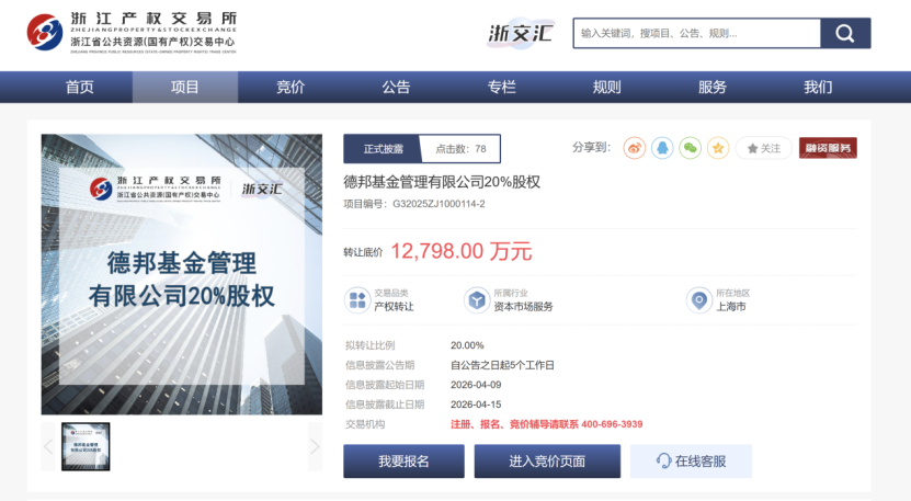 根据浙江产权交易所近日发布的信息,浙江土畜集团将其持有的德邦基金20%股权公开挂牌,信息公示期为4月9日至4月15日。